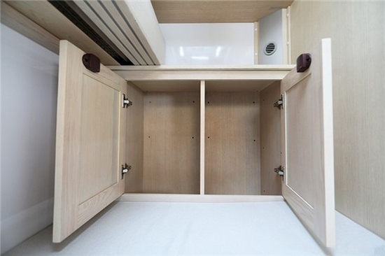 厨房区实木组合式橱柜采用分区域布局设计,由乘客门隔开,不同的功能相互呼应的同时也让做饭井然有序,橱柜推拉式抽屉便于存放日常生活用品及碗具。其它方面配备触摸式集中控制系统+机械式翘板开关、液晶电视、小米盒子、日本YAMAHA八喇叭音响系统(带低音炮)、抽油烟机、微波炉、西门子电磁炉、152L赛特福德房车专用冰箱、大宇3kg洗衣机、特鲁马燃油暖风热水一体机、四路监控、一氧化碳/烟雾报警器等。室内多个220V、12V电源插座及USB充电接口可满足日常充电需求。