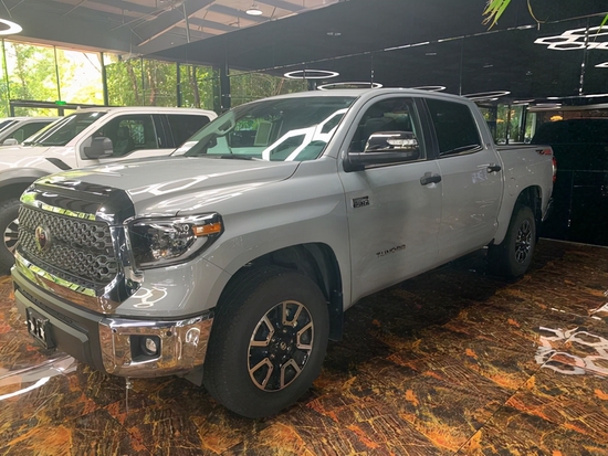 2021款丰田坦途SR5TRD版皮卡排量5.7L自然吸气,8缸V型,最大功率380KW,最大功率转速6500prm,最大扭矩544Nm,变速箱6挡手自一体,四驱两驱切换,车身长宽高(5814*2006*1935mm)最高车速185km/H,轴距3700mm,整备质量2419Kg,油箱容积139升,非承载式车身。