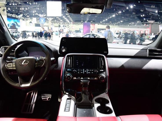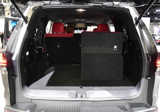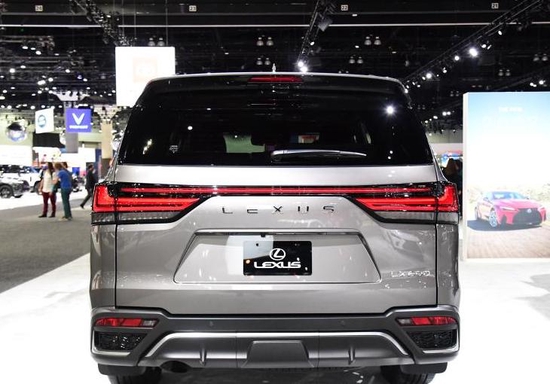 来到侧面,立马就能感受到该车自带的厚重感,以车窗下沿为界,下层车身整体隆起,前翼子板处还镶有不规则造型的装饰亮条,以提高辨识度。此外,在车门下方还能看到脚踏板,前后 22 英寸轮毂呈放射状设计,且每幅轮毂均采用光影设计,营造出雷克萨斯独有的犀利感。尾部,后备厢门与后挡风玻璃在同一水平面处,反倒有些类似商务车的车尾设计,不过,在后保险杠处还能看到不规则样式的下护板,该护板刻画出扩散器的样式,结合双拼色贯穿式尾灯,整体运动气息并不弱,也具备较高的辨识度。