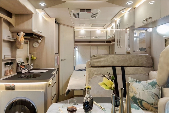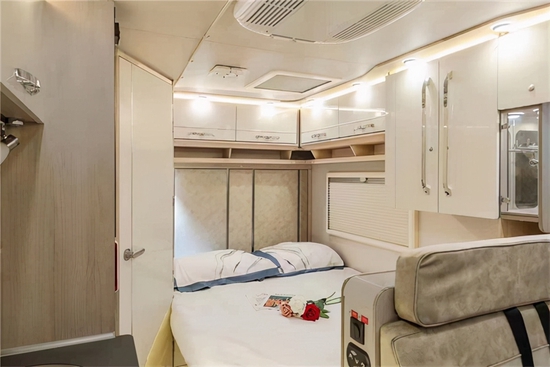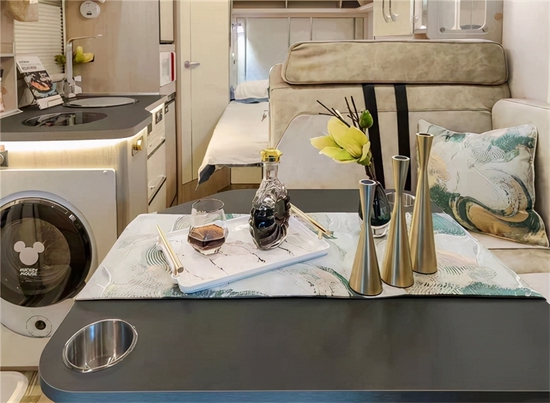 会客区提供了一圈L型的沙发座椅,中间提供了一台可升降的餐桌,上方提供了一排储物吊柜,沙发的材质是皮艺软包,乘坐起来还是十分舒适的。乘客区的上方还提供了一台吸顶式的暖光照明灯,整体布局非常的家居化,设计相当的时尚。