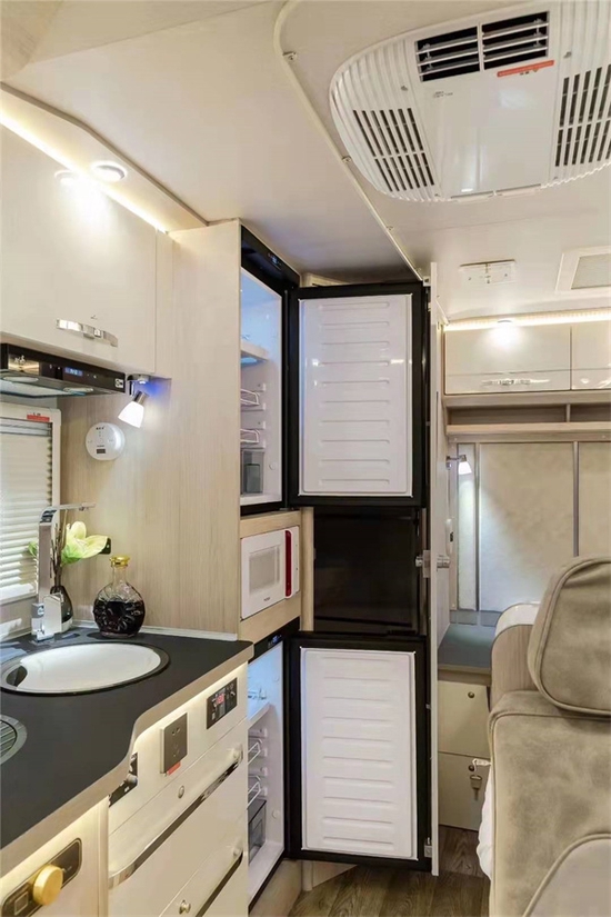 尊致S5选取两台76升英得尔冰箱叠加使用的设计,两台冰箱总容积152升,这样的设计最大的优势就是灵活,一台用于速食冷冻,一台用于时蔬冷藏,也可以都是冷冻或都是冷藏。车厢顶部还设有顶置驻车冷暖空调。