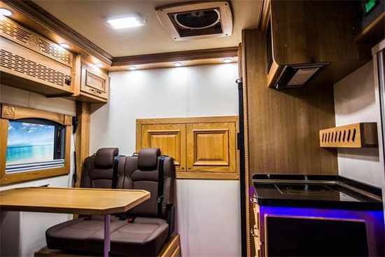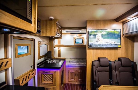 会客区真皮软包对卡座沙发满足4人乘坐,卡座沙发搭配气动升降餐桌可变为一张沙发床;固定式安全带保护行车途中乘客的人身安全。坐垫厚实,弧形靠背也提供一定的支持感,整体来说乘坐舒适感还是不错的;沙发内侧墙壁2个独立外推窗,提供采光及通风换气效果;三菱重工变频空调(单冷)制冷效果快,可手动调节温度;吊柜方便日常收纳物品。