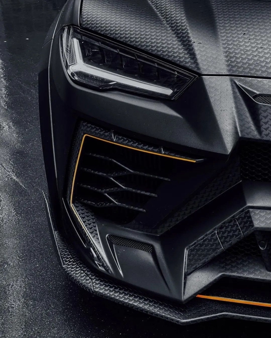 放大细节,可以清楚地看到这头哑光黑“野牛”车头不论:引擎盖、前唇、前保、进气口格栅、出气口饰件等部位都被MANSORY有针对性地添加了大面积飞机纹锻造碳,并辅以兰博基尼经典家族黄装饰线对宽体套件外沿进行勾勒点缀,使Urus前脸呈现出前所未有的丰富层次感和魂动跃然的未来科技氛围。
