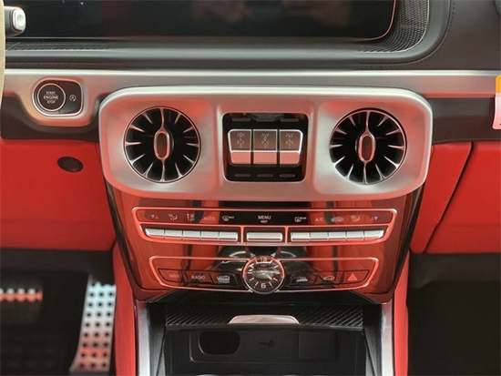 21款奔驰G63的内饰即豪华又充满科技感,中控台多处均采用碳纤维材质覆盖,带彩色TFT显示屏的AMG仪表盘、AMG主菜单和单独的挡位显示器以及采用白色照明的AMG门槛。名贵的选材及精湛的打造都令人拍案叫绝。双12.3英寸贯穿式的显示屏营造出了浓郁的科技氛围。当然了,经典的“三把锁”按键自然不会缺席,并且设置在中控台最为显眼的位置。