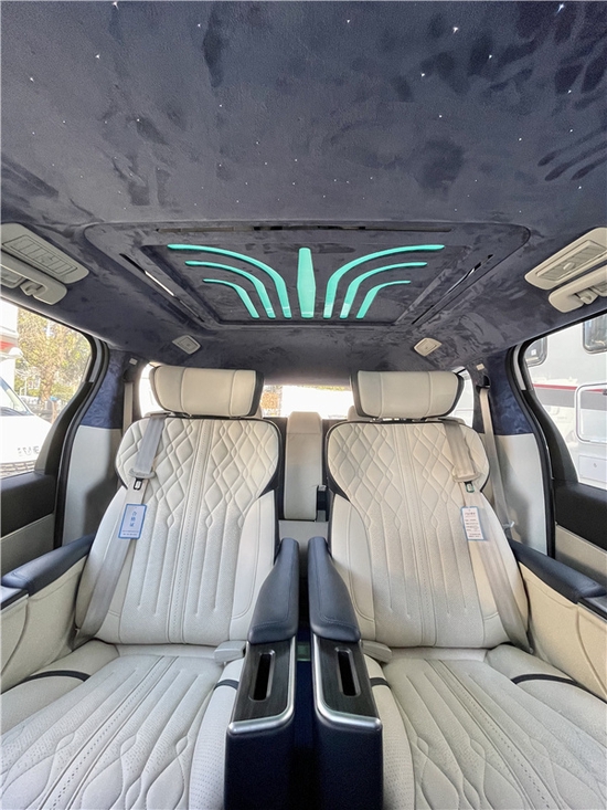 2021款别克GL8“雅典娜”改装版车辆内饰主打简约商务风,该有的功能2020款GL8上都有配备,简约不减配,保证用车舒心。这款GL8在顶部全是做了鹿皮顶的升级与处理,在顶部做了多色可调节的八爪鱼式顶灯,搭配后方的满天星星空顶,有着流星划过的动态效果。超级好看。
