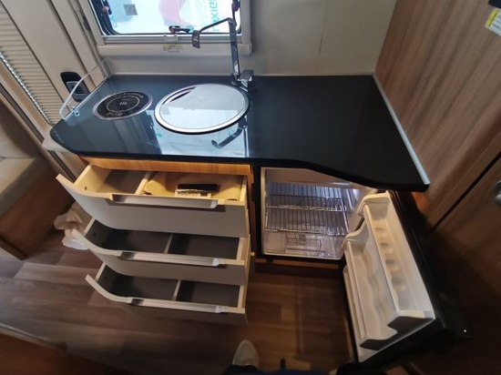 靠乘客门的一侧是整车的厨房区,厨台的面积非常大,在提供电磁炉和水槽的同时还留有一部分空余的台面,时可以用来切菜或放置其他小型的厨用电器。台面下方提供了多个储物抽屉,空间也还不错,旁边是一台88L的单开门冰箱,时可以放一些蔬菜水果,空间也还不错。