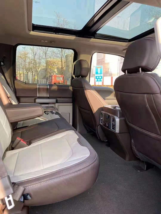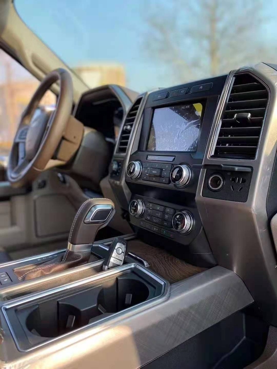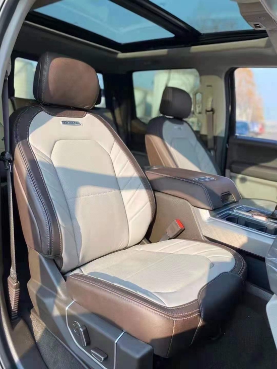 福特F150中控区域布局清晰合理,大尺寸的液晶显示屏提升了其科技感,三幅式的多功能方向盘,加上卧挡类似于游艇一样的档把,给人一种强烈的驾驶冲动,大面积皮革材质的包裹,加上镀铬装饰的点缀,从而营造出了一种舒适豪华的内饰氛围。