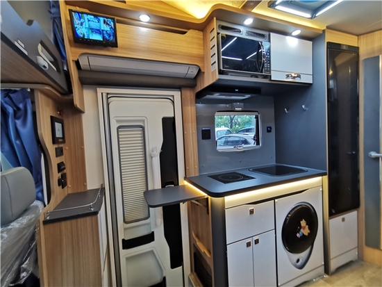 厨房区配置齐全,一体式不锈钢带盖板水槽,吸油烟机、三乔150L直流冰箱微波炉、3kg小天鹅洗衣机、50L史密斯家用电热水器、富士通家用空调等等。厨房内的抽屉和车外共用,合理利用空间。电力集控区设计在上处门右手边,驾驶室后方。