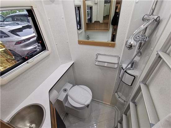 卫生间则位于车辆右侧的最后方,内部安装有马桶、淋浴系统、洗手池、储物台、镜子、换气扇等配置。 该车配备了220L的超大净水箱,60L灰水箱。电路配置了100安的铅酸电池。(可选装28888元的能源包。内含800安锂电池、800w太阳能板)实现水电无忧。