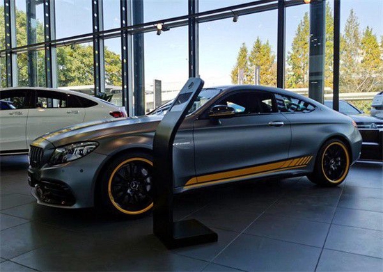 车身侧面线条流畅,Coupe版车型为双门设计,提供18/19英寸不同样式的AMG运动轮毂,红/黄/银三种颜色刹车卡钳可选。车尾上方配有小型碳纤维扰流板,两门版车型LED尾灯组内部改为“C”字型灯带,排气为双边共四出式布局,并配备扩散器。