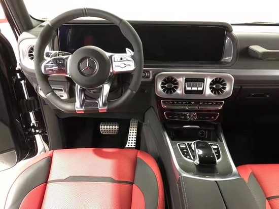 奔驰G63采用了奔驰最新的双屏幕式设计,全液晶仪表盘和中控台屏幕都达到12.3英寸。同时内饰质感和工艺都有了很大的进步。家族式的连屏设计则凸显了车内的科技感。当然了,经典的“三把锁”按键自然不会缺失,并且设置在中控台最为显眼的位置。