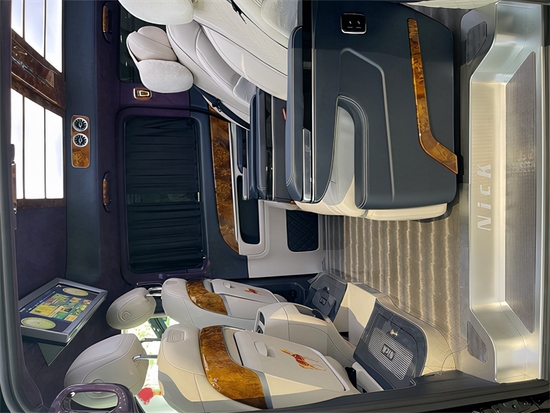 在驾驶舱和乘坐舱之间,设计了一款液晶电视半隔屏,娱乐功能也是非常齐全的,往后延伸的是飞机航空舱的顶部造型,这是独家研发的一个造型顶,整体开模,进入了乘坐舱之后就感觉进入了飞机头等舱,尽享奢华尊贵。