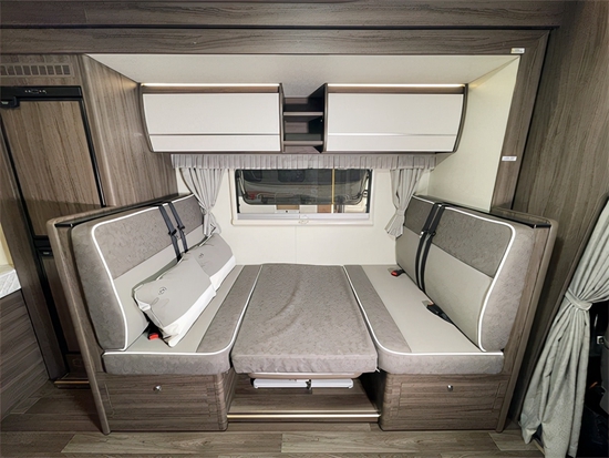 车身内部采用欧陆风格设计,使内部空间简约大气,额头区域两侧设有推拉窗有防蚊纱窗以及隐私窗帘的设计保障了我们的通风性,顶部设有天窗提供采光通风,并且夜晚也可躺在上方欣赏夜景,额头床部位配有推拉电视、车内环绕音响,为我们提供良好的视听效果,会客区采用对坐式卡座,为我们提供良好的会客环境。