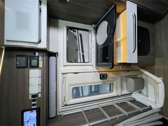 水路系统方面,180L净水箱、45L灰水箱。电路系统方面,800安锂电池,400w太阳能板。靠后拓展床侧面墙壁配有四个独立挂钩,日常可挂衣物;旁边则是多个储物柜及抽屉,可以根据内部空间大小放置尺寸相等的物品。后横置床拓展后可变成一张尺寸为1900×1250(mm)的双人床,满足一大一小的睡眠使用,上方敞开式储物槽及吊柜满足日常收纳需求。尾部车窗面积可观,采光及通风换气效果不错,还能随时欣赏窗外的风景。