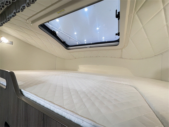 整车前左侧为4人对坐沙发、右侧为厨房区域、中部为卫生间,尾部为横置双人床铺,布局人性合理,整体可实现6乘6卧,符合国人生活习惯,可容纳多种生活方式。前额部分设有固定大床,尺寸为:1170×2100(mm),空高650,配有透气大天窗,睡眠空间不逼仄。 床板部分可翻折,下方为32寸高清液晶电视。双向拓展可以给车内带来更大的空间,左侧可向外拓展600×2600(mm),尾部向后拓展后可将尾床加宽加大,为客户提供一张2000×1250(mm)固定双人床,将合理空间有效利用。