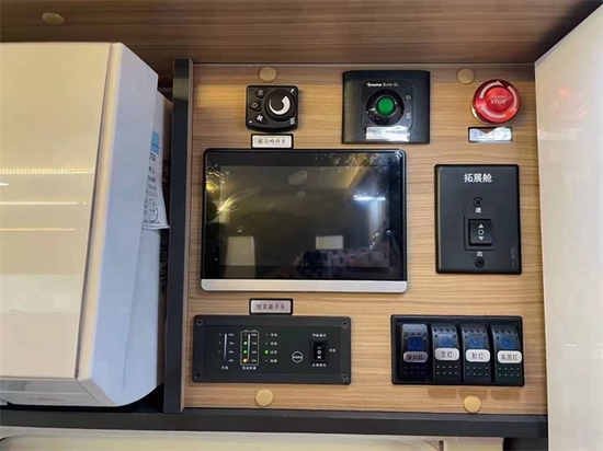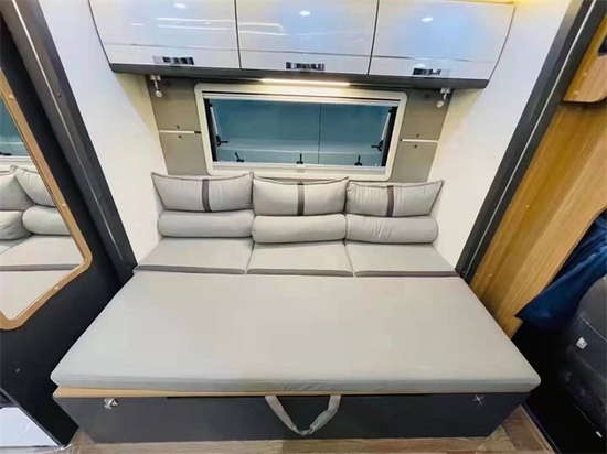中部的会客区是本车亮眼的一部分 。 因为本车采用后车门设计 , 为会客区拓展了额外的空间 。 会客区不仅拥有双人对坐卡座 , 还有一排的单排沙发 , 将内部空间利用到了极致 。 驻车时 , 单排沙发可以向外拓展 , 变成一张舒适的双人沙发床 。