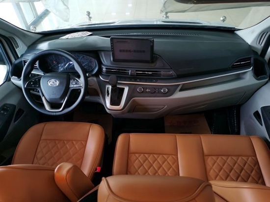 21款上汽大通V90B型房车驾驶室内部看去和乘用车一模一样,多功能方向盘,中间带有超大尺寸的液晶显示屏,显示屏可以控制车辆多媒体功能以及倒车影像。