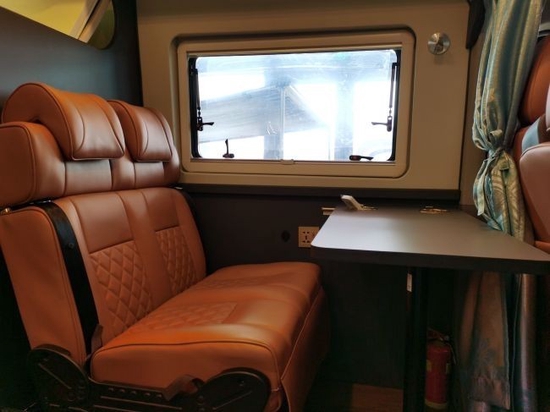 21款上汽大通V90B型房车车厢内前排座椅可以旋转,卡座中间安装了多功能的桌板,结合可旋转的座椅使得卡座可以变成一张拼床。卡座周边还设置了充电插座,破窗锤,灭火器等多功能配件。