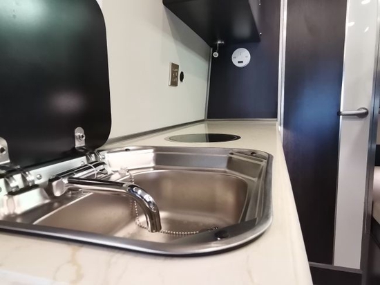 21款上汽大通V90B型房车厨房区位于会客区的对面,白色的厨房豪华理石台面上配备有带盖水池、折叠水龙头以及一个电磁炉,灶台的旁侧配备有电源接口,宽敞的台面上可以放置一些常用的烹饪电器辅助做饭。