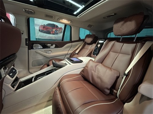 新款迈巴赫GLS600最大的亮点还是第二排,毕竟是一辆定位奢华品质的大型SUV。在取消了第三排座椅之后,后排完全可以容纳下一个更加舒适和功能更多的行政座椅,而且腿部空间也大大提升。后排还带有一个可以装香槟的冰箱,同时配有香槟杯架,此种设计使整个座舱充满了仪式感。