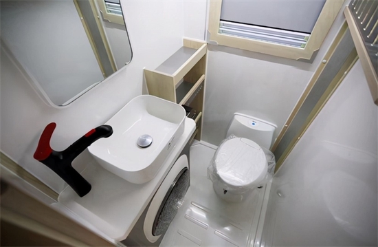 会客区真皮软包对卡座沙发满足4人乘坐,卡座沙发搭配气动升降餐桌可变为一张沙发床。固定式安全带保护行车途中乘客的人身安全。坐垫厚实,弧形靠背也提供一定的支持感,整体来说乘坐舒适感还是不错的;沙发内侧墙壁2个独立外推窗,提供采光及通风换气效果;三菱重工变频空调(单冷)制冷效果快,可手动调节温度,吊柜方便日常收纳物品。本款房车是越野专用方舱,热断桥硬化铝骨架六层加强保温车身,厚度60mm,耐零下30度。标配400L清水、1600AH锂电、德国纽福克斯3000W+3000W逆变器(防辐射处理)等。