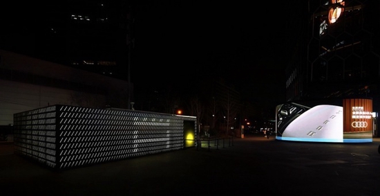 以“H型元素”为灵感创作的外部造型通过两个立方体展示全新奥迪A8LHorch创始人版 “传承经典”和“领启未来”的两个方向,分别呼应橡木绿(Oakgrun)和雨云灰(Nimbusgrau)两款配色,暗空间象征辉煌历史,光空间寓意光明未来。外观设计还充分运用灯光科技,以“数字矩阵式LED车灯”为灵感,将橡木绿色的哑光金属板进行数字化切割,打造富有动感的灯光立面。令人瞩目的全新Horch专属Logo设计还以呼吸灯箱的形式覆盖在展厅外立面,象征创始人精神的永恒闪耀与生生不息。