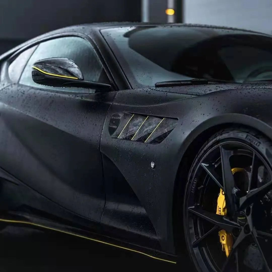 MANSORY Stallone全车涂装黑色哑光漆,亮黄色装饰线及卡钳的勾勒点缀呈递出强烈的动感跳跃视觉。车头诸如:前唇、前保险杠、出风口格栅、轻型通风口等部位的空气动力学组件均采用MANSORY自家生产的高工艺锻造花碳打磨而成。在材料界有着“黑色黄金” 之称的碳纤维富含:轻量、坚固、抗拉伸、耐腐蚀、耐高温等大量优良属性,用其包覆车头不仅提升了前脸观感和霸气指数,同时也进一步强化了车辆的空气动力学系数。