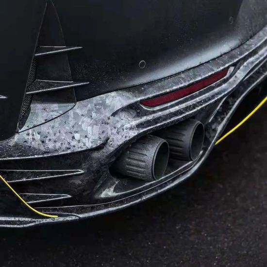 尾部的改变同样不简单,MANSORY为Ferrari 812 Superfast打造的碳纤维后包围件拓宽了整个车尾,不论远观还是近看都显得厚重而又富有“内涵”;后保险杠带出气格栅、后面板、后置扩散器、后车灯盖等部位也无一例外使用锻造碳包覆升级。哑光黑漆面与碳纤维的组合堪称“浑然天成”,丰富的立体层次感和精奢华贵气跃然于表,共同营造出一派魂力泗射的热血战斗氛围。