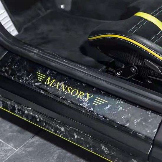车身部位MANSORY Stallone彰显出远胜原厂的狂野凌厉——侧裙、侧面板、前翼子板带出风口、后视镜面罩等部位皆用锻造花碳做了替换。当开启车门,印有亮黄色MANORY飞翼徽标的“碳化”踏板映入眼帘,令人大呼“讲究”!