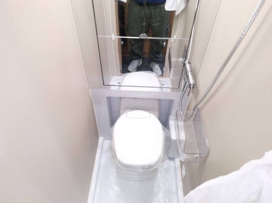 会客区的后面就是卫生间,卫生间的空间可圈可点,能容纳一个成人洗澡。卫生间内配有马桶、浴帘、抽拉式水龙头、洗脸盆、化妆镜和换气扇等。
