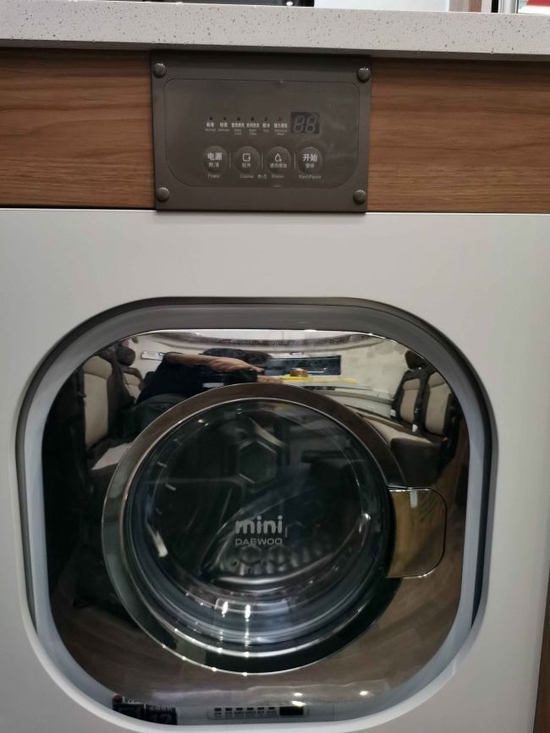 会客区的对面就是厨房区域,厨台上配有不锈钢洗菜池和电磁炉。厨台的下方一侧是抽屉和滚筒洗衣机。厨台上方配有车载抽油烟机和储物柜。