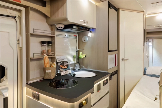 会客区提供了一圈L型的沙发座椅,中间提供了一台可升降的餐桌,上方提供了一排储物吊柜,沙发的材质是皮艺软包,乘坐起来还是十分舒适的。乘客区的上方还提供了一台吸顶式的暖光照明灯,整体布局非常的家居化,设计相当的时尚。