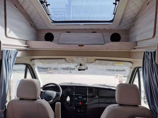 驾驶室配备多功能方向盘,中控台,副驾驶座可以向后旋转,与会客区对坐,形成一个小的会议空间,方便车内人员沟通交流。整车车内风格清新自然,多采用生态板材家具,简约自然、清新舒雅。