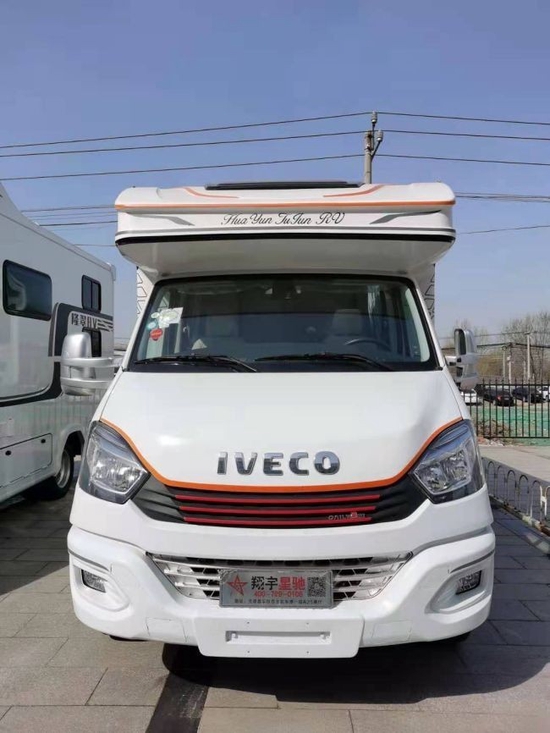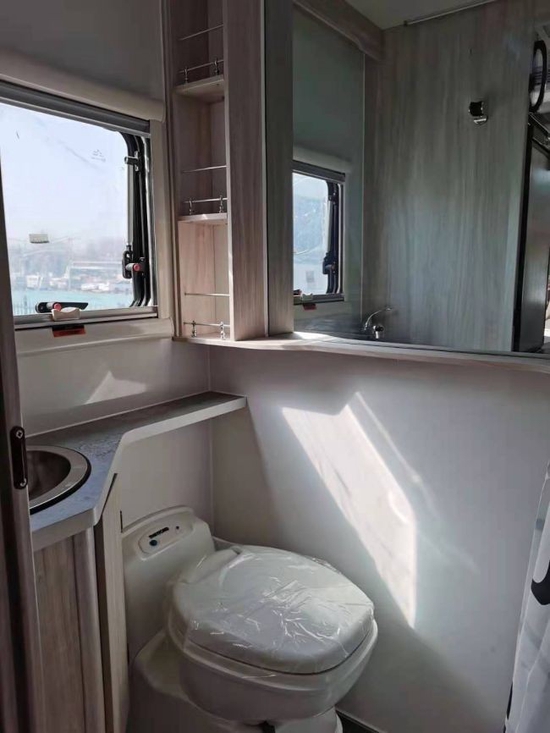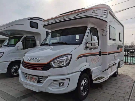 这款小额头房车长宽高分别为:5990mmX2350mmX2980mm,满足了C本蓝牌驾驶,整车车体为高强度FRP三明治设计,全铝制结构骨架,轻量化的设计让旅途更舒心安全。独具匠心的刀锋式小额头是这款房车特有的标志,不仅美观,更在车辆行驶中,起到减小风阻,保证驾驶安全的作用。