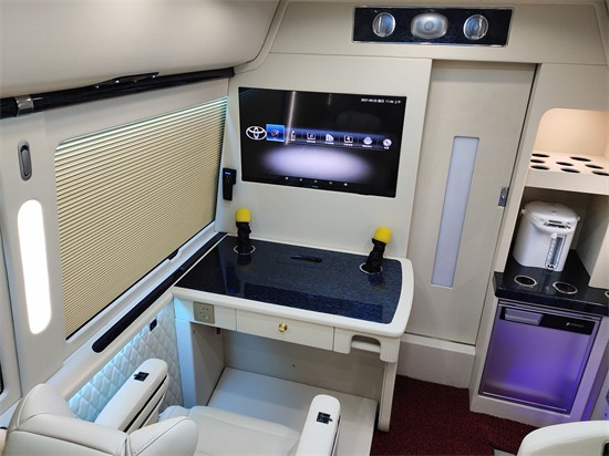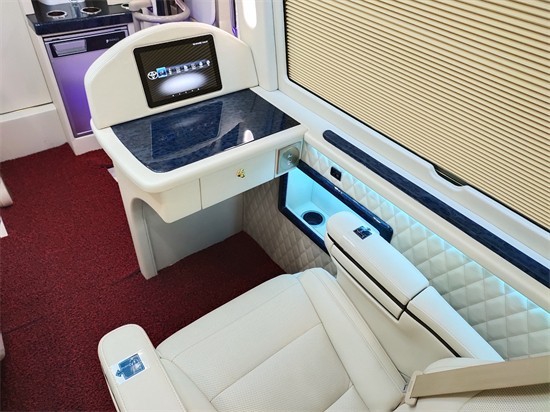 丰田考斯特从座位的布局上采取了后排座位数为四个,中间三排采用左二右一的的布局,前排为豪华首长席,并且配备办公桌以及固定秘书桌。在上车门的右端安装并向设备,主驾驶后有隔断分离。如此设计,乘车空间宽敞,设计贴心,豪华的办公桌椅带给我们不一样的乘车感觉。丰田考斯特改装商务车,再配备上豪华的地毯,美观的窗帘。以及其他一些细节的装饰。丰田考斯特商务车改装前后的效果简直是判若云端,但是改装没有终点,只要市场的需要,丰田考斯特改装商务车就能够满足客户的需求。丰田考斯特改装商务车,由内而外的设计,打造最出众的商务车。
