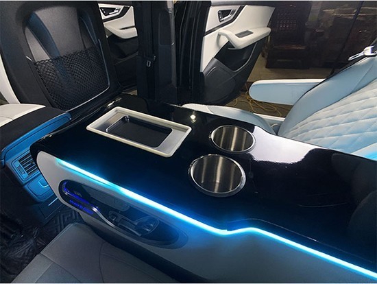 中间扶手箱有一个手机无线充电功能外带两个杯托,左右各带一个控制面板控制座椅调节功能。