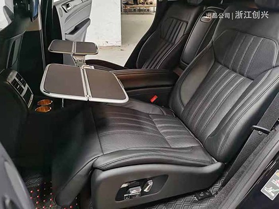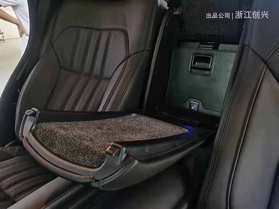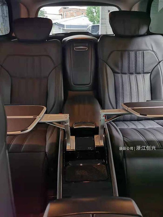 升级后排以后变更成四座车,后排带有隐藏式的飞机桌板,平时在车上也可以拿出来办公,不用的时候可以收回去完全不碍空间,这也是奔驰的精髓吧,长途出差,外出办公不浪费你宝贵时间,提供移动办公之旅,或者也可以当小桌板吃吃饭,给小孩写写作业什么的。另外航空座椅带有电动腿托功能,其实乘坐体验上带腿托和没腿托相差感真的很大,有腿托舒适度高很多的。