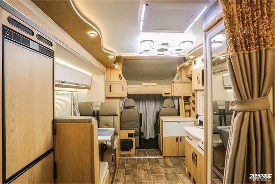 车内源于欧洲工艺家具、黄色橡木纹理和进口地砖纹理地板革等都营造了一种极为豪华的内饰氛围感。驾驶室上方额头双人床的设计,尺寸为2180×1500(mm),配有天然乳胶床垫,满足两名成年人休息不成问题,周围均进行了软包处理;额头床翻折起来是一台40寸高清液晶电视;驾驶室与车厢之间还配有隐私帘,保证了两边的隐私性。此外还配有丹拿音响+JBL低音炮+富声功放系统,提供了高品质的视听盛宴。整车核载6人。