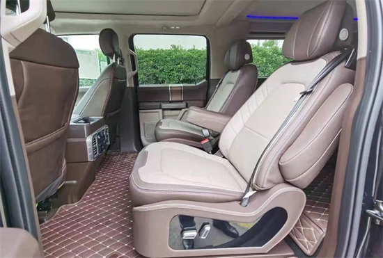 2022款国六 F-150福特勇猛者平顶内部铺陈进口柚木地板,二排设置了两张带独立腿托的CEO级航空电动按摩座椅,总体空间更宽广修更豪华,氛围更精奢,适用于商务接待或家族旅行而采用不隔断计的F-150福特勇猛者平顶车型乘客舱看起来就简约了许多。