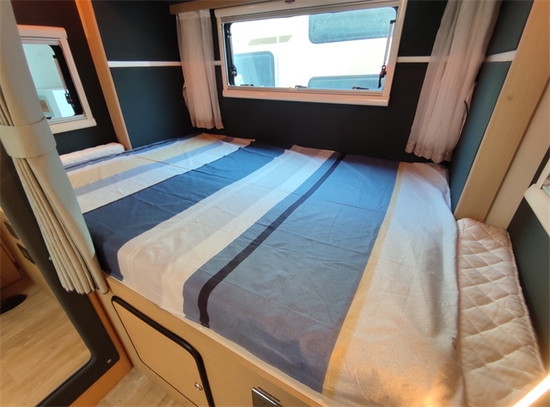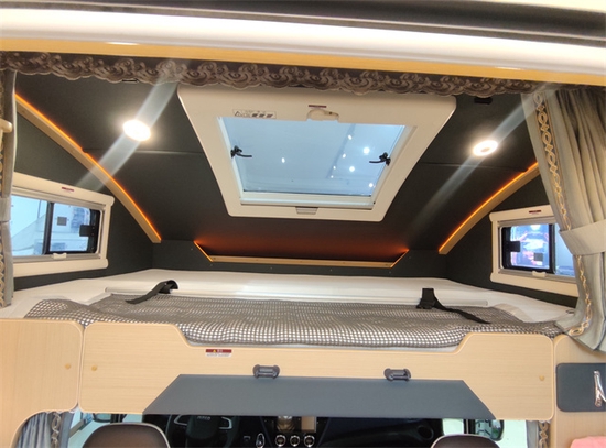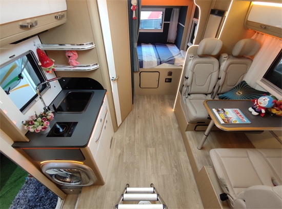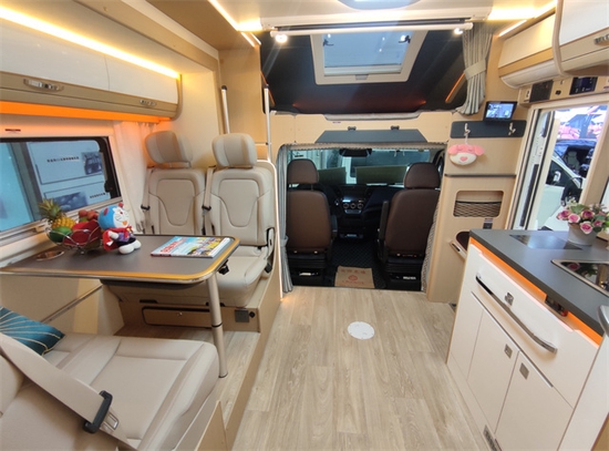 内饰风格采用的是意式风格,由著名的IDG设计公司设计打造。完美体现出简约,大气,温馨的氛围。以米色和浅棕色为主体配色,加上部分橙色的氛围灯,更显温馨舒适。会客区为4人座奔驰原装豪华沙发座椅+升降餐桌的组合,整体均位于拓展结构上,驻车时可扩展车内空间。在车内的娱乐设施上,并没有选用常见的额头床下方电视,而是配备有极米投影仪。因为采用的不是额头床电视的设计,额头部分的横梁不切,安全性更好、搭配进口JBL音响,可以完美体验到家庭影院的效果。