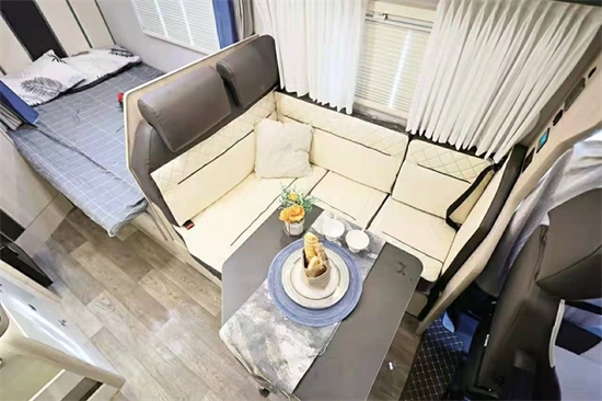 纪念版Y9在箱体上做了加宽处理,使内径宽达到了2.3米,同级产品中最大。所以,虽然Y9是不拓展车型,但是内部空间却不拥挤。会客区设计了L型沙发卡座,可升降餐桌,驻车休息时,可以将升降桌放下,形成一个单人床。在沙发卡座的对面,设计了一个单人小沙发,与会客厅形成了闭环。额头床依旧是2300*1400mm的尺寸,带爬梯,可方便上下床。