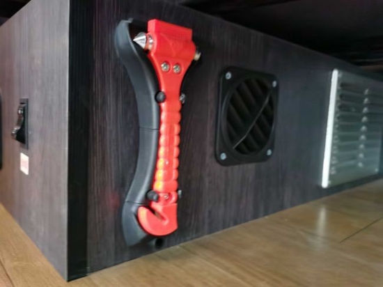 21款上汽大通V90B型房车车厢内前排座椅可以旋转,卡座中间安装了多功能的桌板,结合可旋转的座椅使得卡座可以变成一张拼床。卡座周边还设置了充电插座,破窗锤,灭火器等多功能配件。