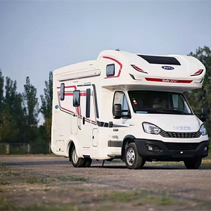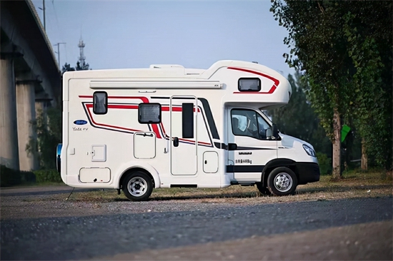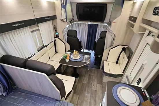 驾驶舱与后方生活区贯通式设计有效避免频繁上下车;过道上方是一台房车专用32寸车载智能电视,搭配车载音响套装(双扬声器),可为你的旅行提供全方位的观影娱乐体验;家具颜色选择了深浅撞色,搭配氛围灯营造出一种温馨奢华的氛围。布局方面,从前至后依次为驾驶室、会客区、厨房区、卫生间和休息区。四周都有储物柜,零碎的小物件收纳在里面,也不怕随意放置弄丢了。