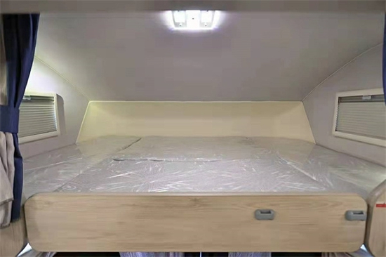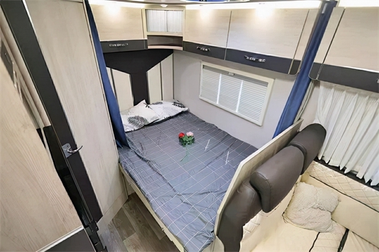 纪念版Y9在箱体上做了加宽处理,使内径宽达到了2.3米,同级产品中最大。所以,虽然Y9是不拓展车型,但是内部空间却不拥挤。会客区设计了L型沙发卡座,可升降餐桌,驻车休息时,可以将升降桌放下,形成一个单人床。在沙发卡座的对面,设计了一个单人小沙发,与会客厅形成了闭环。额头床依旧是2300*1400mm的尺寸,带爬梯,可方便上下床。