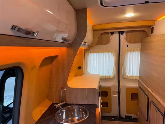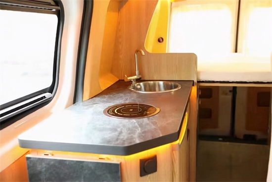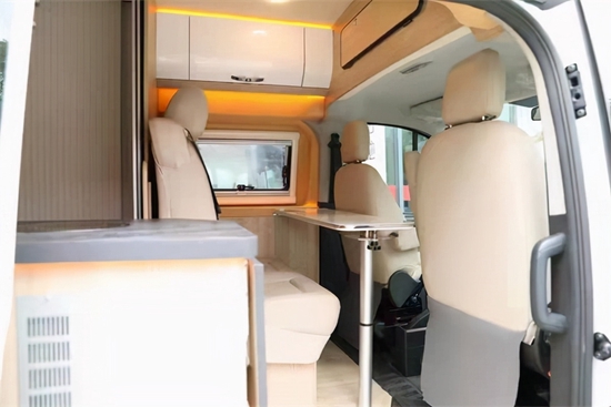 独立的2个单人座椅,并排安装,也可装一个连体的双人座椅,座椅可以前后滑动,靠背可以向后翻转适合自己的一个仰角,在旅途中后排的乘客可以舒适的小睡一觉。车内的厨房区域配置也相当丰富,一个洗菜池,一个电磁炉,但它能够体现简单而华实!70L镜面冷藏冷冻与一体的冰箱,啤酒饮料,水果蔬菜,肉食等旅行生活必需品,都可以携带。