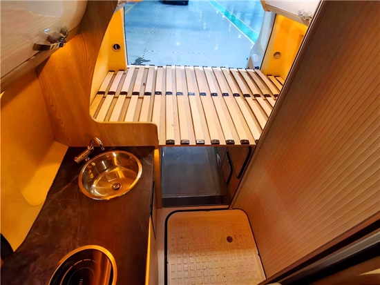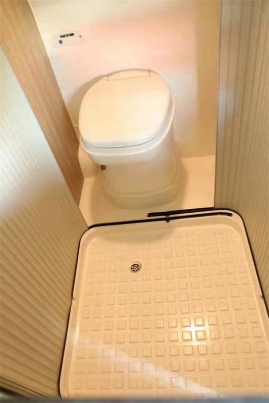 尾部是横置床的布局,尺寸为1850 x1200mm,可睡下两个身材匀称的成人。卫生间内配有防滑漏水地板,有电动马桶以及洗脸台盆,配有洗漱淋浴一体式水龙头。这款房车配有清水箱60L和污水箱42L。好了本款铂驰福特V362升顶房车小峰哥就同大家介绍到这里。阅览世间美好,带您跨越山河,品味人间烟火,给您一个移动的家 -我是小峰哥