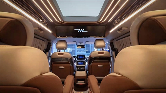 后车舱多功能空间,全车皮质手工包覆,仿大理石高级耐磨地板,玫瑰金饰件,顶部29寸宽屏显示器,LED顶灯、环绕灯带;C柱装饰LED壁灯,中门及后排遮光窗帘……伟昊商务车众神版以极具奢华感的智能人性化设计,在实用配置+伟昊智能化座舱生态系统的加持下,最大限度地提升了每一位车主的用车体验,让出行更加舒适和享受。