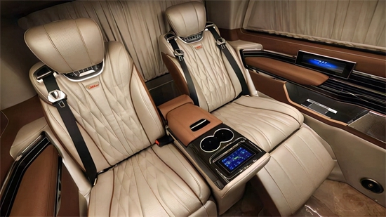 第二排航空头等舱座椅,是豪华商务车的标配,不仅奢华,且拥有非常好的舒适乘坐感,座椅是根据人体工学设计,只为了能给您全方位的身体舒展放松,在内饰精致细节处的理上,整车也是做到了匠心独具。第二排座椅可以旋转与第三排形成对坐,可以成为一个临时的会议场所。更重要的是后排的三人连座,除了常规的乘坐,仰卧,前后滑动等功能外,还有电动放平为乘客提供临时平躺休息的“大床”,让车内成员在外出旅行劳累时可临时小憩。
