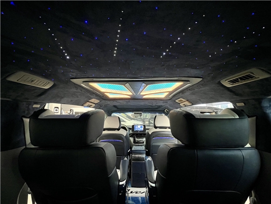 全车高光镜面亚克力地板带有艾维亚标识,顶部麂皮绒包覆的动态星空顶,让您在车内乘坐感受到豪华、惊艳绝美的氛围环境。