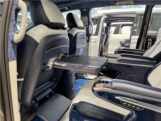 侧板的压花做得很精致高档,中排的航空座椅有着“水晶宝座”的雅称。带有六项调节,通风加热与气动按摩,底座带有旋转功能。这些都为贵宾舱加分不少,乘坐体验与视觉美感协调统一。特别值得一提的是它的“水晶扶手”有点宝马7系水晶档把的感觉,而且有着64色的氛围灯循环。不论是给娃坐还是给老婆坐,都比原厂的座椅提升了n个档次,通风按摩加热不说,至少带娃累的时候,放倒就是一张躺椅。